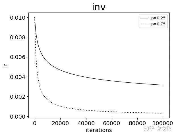 5.4 inv 其中$\gamma$和power都需要设置 gamma控制下降速率,power控制曲线在饱和状态下学习率达到的最低值。可以理解成当epoch达到最大值的时候,学习率在不同的power下最低值不一样。