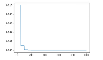 5.10 code 1 2 3 4 5 6 7 8 9 10 11 12 13 14 15 16 17 18 19 20 21 22 23 24 25 26 27 28 29 30 31 32 import matplotlib.pyplot as pltx = list (range (1000 )) base_lr=0.01 def step_lr (epoch ): step_wise=50 gamma=0.1 return base_lr*gamma**(epoch//step_wise) y = [step_lr(i) for i in x] plt.plot(x,y) def exp_lr (epoch ): gamma=0.999 return base_lr*gamma**epoch y = [exp_lr(i) for i in x] plt.plot(x,y) def inv_lr (epoch ): gamma=0.1 power=0.75 return base_lr*(1 +gamma*epoch)**(-power) y = [inv_lr(i) for i in x] plt.plot(x,y) def multi_lr (epoch ): step_wise1=200 step_wise2=300 step_wise3=400 gamma=0.5 power = [0 ]*step_wise1 + [1 ]*step_wise2+[2 ]*step_wise3 if epoch<len (power): return base_lr*gamma**power[epoch] else : return base_lr*gamma**3 y = [multi_lr(i) for i in x] plt.plot(x,y)
