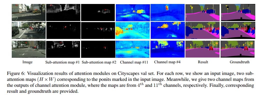 对于 position attention,得到的 $E\in R^{(H\times W)\times (H\times W)}$ ,可以理解点与点之间的相似性,对每个图片,选两个点,记为 ( #1 and #2 ),并且展示这两个点的 position attention map. 第一张图 #1 标记的是建筑物, #2 标记的是车,第二张图分别标记的是交通标记和行人,第三行标记的是植物和行人。可以看出来,同一类事物哪怕离得远也可以标记出来,不同事物哪怕离得近也标记不出来。或者说, position attention 具有在全局的角度来标记同一类事物,哪怕离得远,哪怕事物很小,同时区分近距离的不同事物。